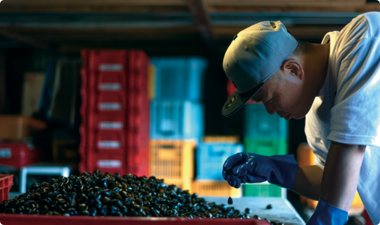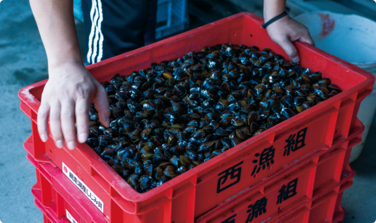 しじみは強い生き物で、比較的腐りづらいと言われています。しかし、お客さまに美味しく召し上がっていただくことを考えると、鮮度は命。漁に出るのは朝4時。外気が暖かくなる前に採って帰港することで、鮮度を落とさないようにするためです。また、採った後の「選別」もとても重要。1粒でも死貝が混ざろうものなら、それだけで臭くなって食べられなくなるほど。そのため船上・地上・仲買人のところと計3回の選別を実施。コンクリート板に貝を当てて、その音の響きで状態を見分けたりもします。地道な作業は、しじみの魅力を余すことなく伝えたいからに他なりません。